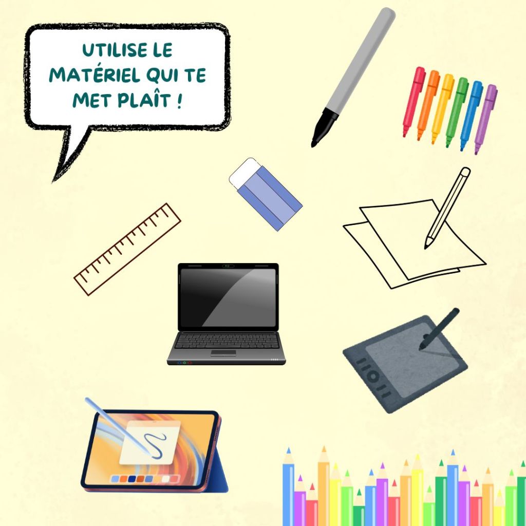 - techniques de couleur au choix (feutres, crayons de couleur, numérique)